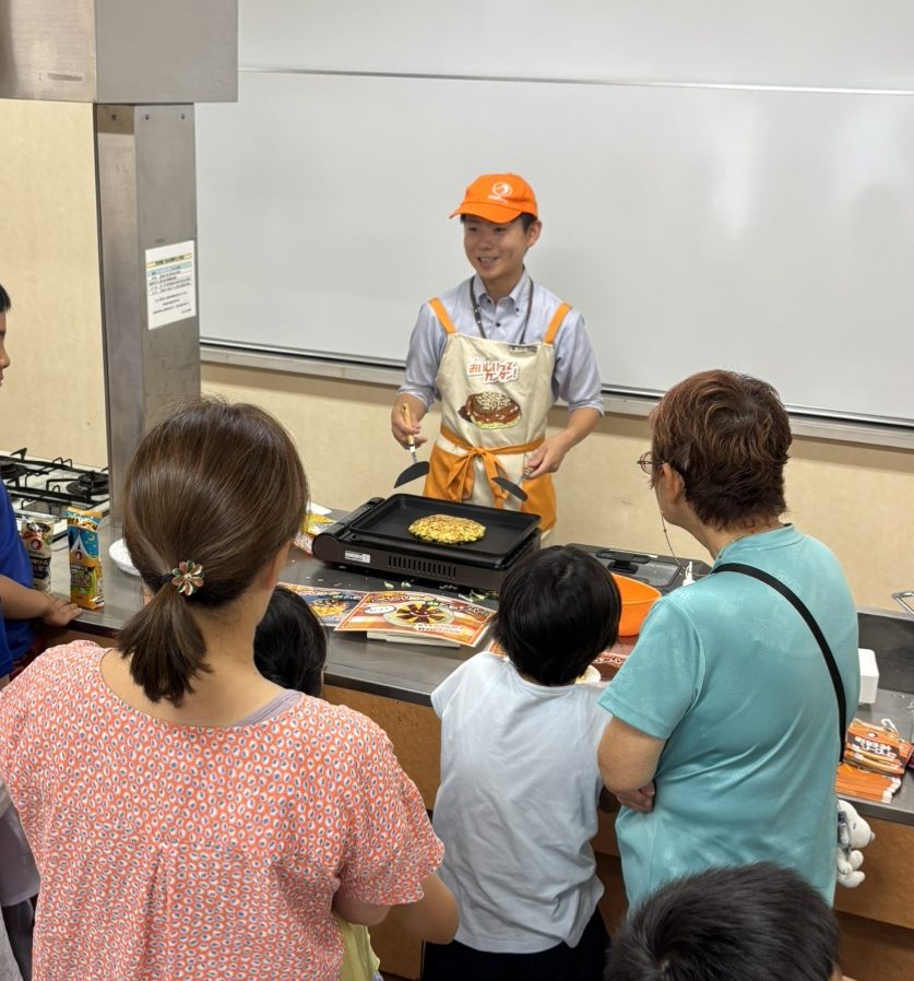 今回の講座はキッズ対象『親子でつくろう「お好み焼き」』で親子17名の方が参加してくれました。親子で楽しく・安全に、そして美味しい焼き方のコツなどを当社の取引メーカーであるオタフク様に講師になってもらい調理デモンストレーションをしてもらいました。