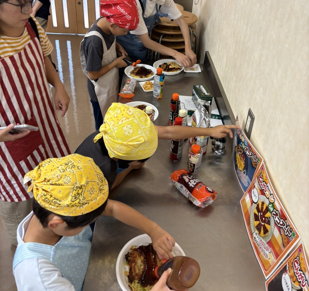 そしてその後は保護者の方と一緒になって「お好み焼きつくり」、焼きあがってからは各々好きなデコレーションし楽しく『おこアート』を行いました。